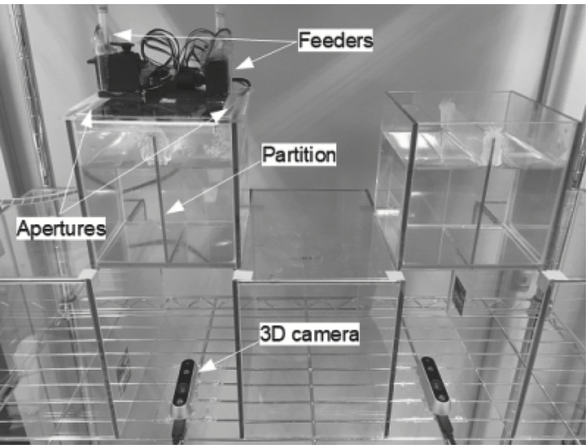 The home/experimental aquarium was elevated by placing it on the edges of two empty aquariums (see Figure 1). A 3D camera (Intel. RealSenseTM D435 model) was placed underneath, 20 cm away from, and parallel to, the bottom of the aquarium. An infrared (IR) projector built in the camera was turned on in an attempt to increase the precision in depth measurement. The camera generated approximately 30 sets of color and depth frames per second. These frames went through a series of image processing to track the center of their body (see Kuroda, 2018, for details).