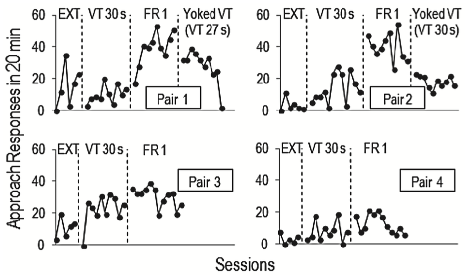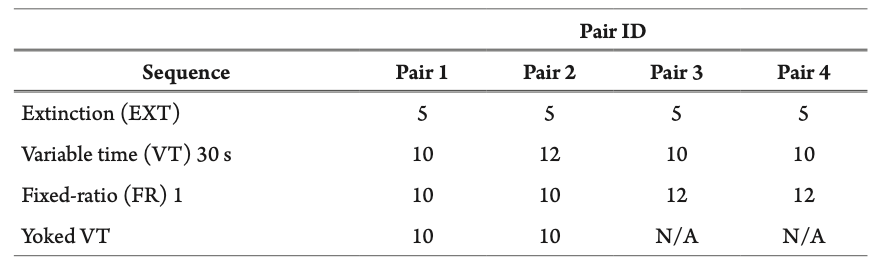 Experimental conditions. For each pair of fish, the sequence of conditions was exposure to extinction (EXT), variable-time (VT), fixed-ratio (FR), and yokedVT contingencies. Table 1 shows the number of sessions conducted with each condition in effect for each pair of fish.