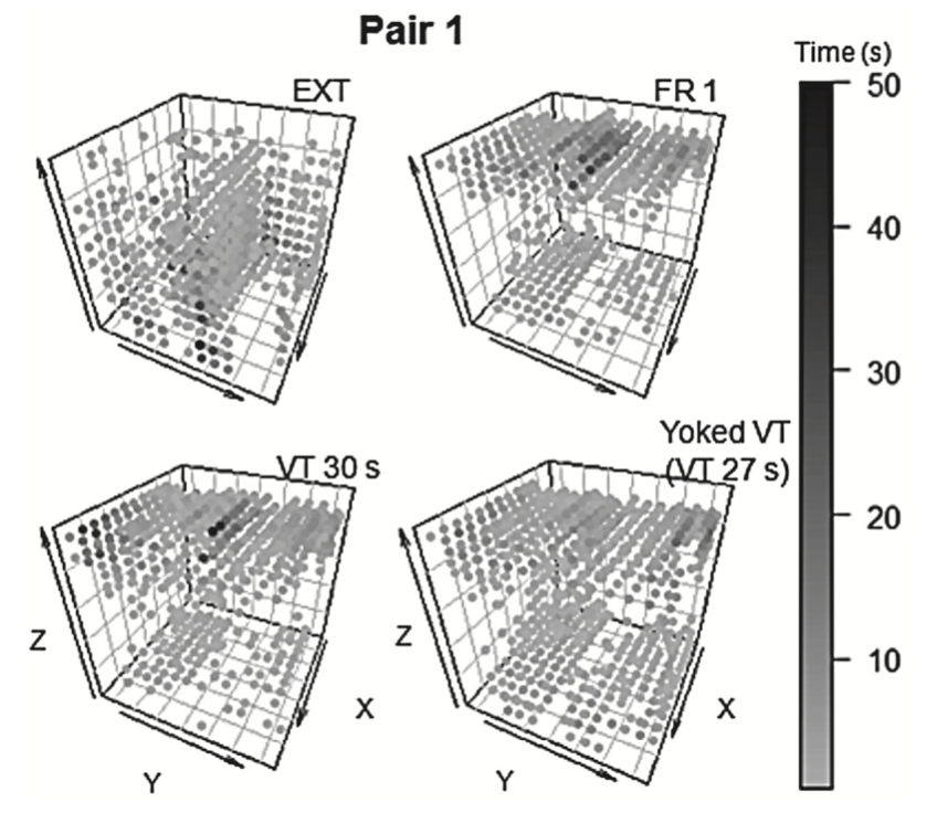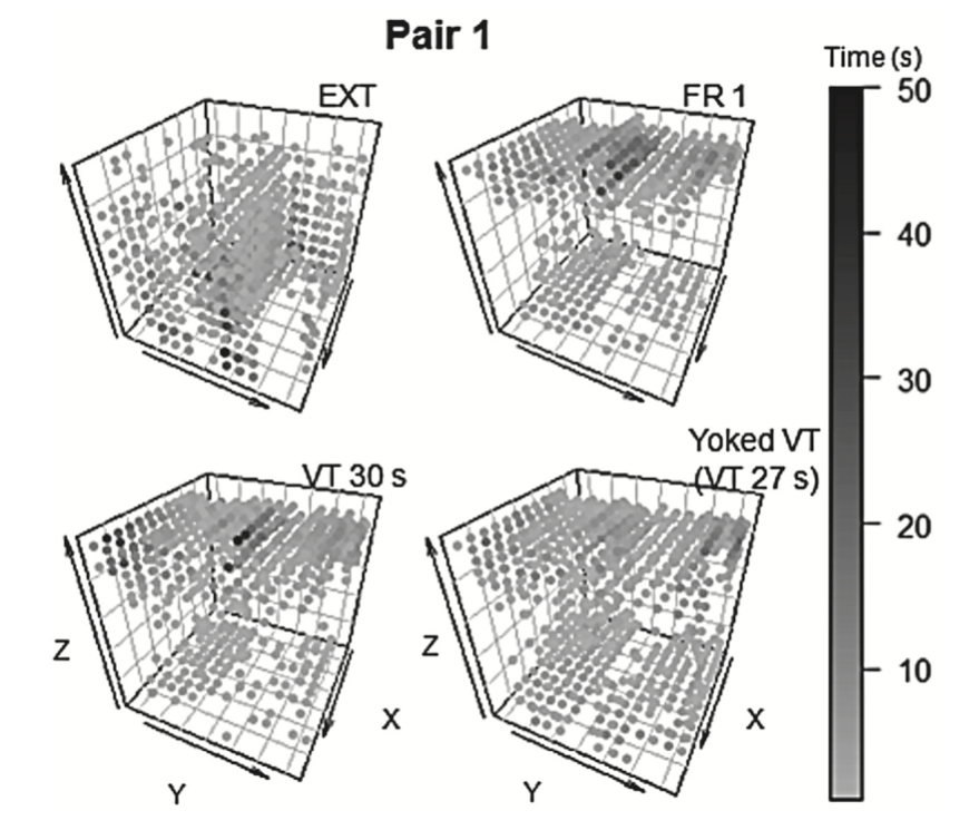 The time spent at each segment of the aquarium for the fish in Pair 1 in the last session of each condition. Male and female fish were on the left and right ranges on the y-axis, respectively. Each dot represents a 1-cm3 segment. The grayscale represents the time. Reinforcement time is excluded from the analysis. The dots with the time spent less than 1 s are not displayed in the graphs. EXT, VT, and FR stand for extinction, variable-time, and fixed-ratio schedules, respectively