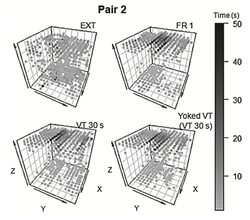 Figure 3 shows representative 3D trajectories of fish motion: The trajectories were for Pair 1 in the last session of each condition. The black lines in the trajectory represent the motion during the 5-s food-delivery time. In the EXT condition, the fish appear to have spent a large portion of time near the glass partition. Comparisons of the VT, FR, and yoked-VT conditions suggest that the fish were more likely to be near the water surface in the FR condition, especially, during food delivery. Results of the other pairs of fish in these conditions generally were similar to Pair 1 (data not shown). For a clearer analysis, Figures 4a (Pair 1), 4b (Pair 2), and 4c (Pairs 3 and 4) show the time spent at each 1-cm. segment of the aquarium in the last session of each condition. The grayscale on the right side of the graphs represents the time spent, ranging from gray to black with the latter indicating longer times. The analysis excluded the food-delivery time to equate total duration across the conditions. Moreover, the time of less than 1 s spent in a location is not displayed to minimize overlaps among the dots in the graph. Pairs 1, 3, and 4 spent a large portion of time near the glass partition in the EXT condition. In the VT, FR, and yoked-VT conditions, the location where the fish spent most time shifted to the water surface when food was delivered either dependent on or independently of responding. Thus, food delivery per se affected the distribution of behavior in the aquarium. Among these three conditions, however, the time spent near the water surface and near the glass partition was prominent in the FR condition for each pair of fish. Although the response-rate graph (Figure 3) suggests failures in response acquisition for the fish in Pairs 3 and 4, the time-spent graph (Figure 4a -4c) shows the fish in Pair 4 were more likely to be near the glass partition and near the water surface in the FR condition than the preceding VT condition. Thus, the reinforcement contingency actually may have been effective in decreasing the distance between these fish but not as close enough as required for response registration (i.e., the Euclidean distance of 1.5 cm).