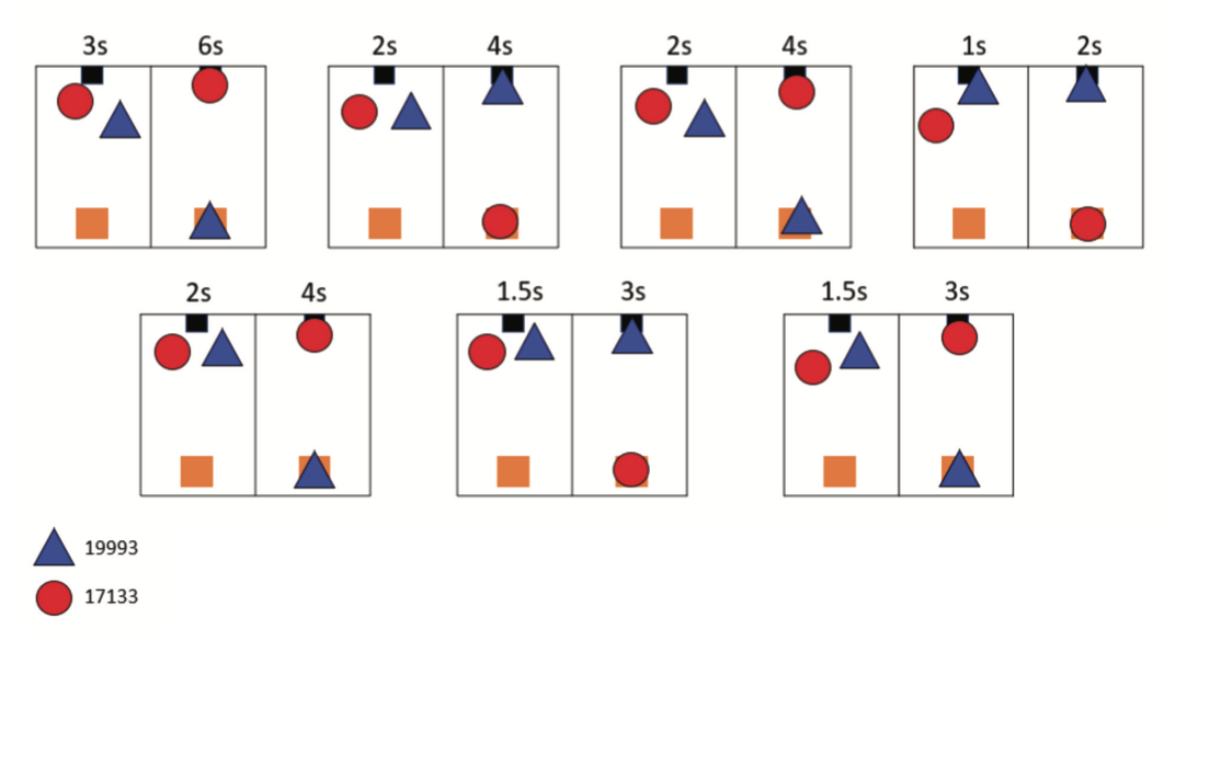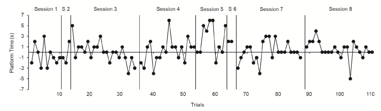 Difference in Platform Time between the two pigeons calculated by subtracting 17133’s platform time on a given trial from 19993’s on the same trial. Data points above zero indicate that 19993 spent more time on the platform than 17133 on that trial. Conversely, data points below zero indicate that 17133 spent more time on the platform than 19993.