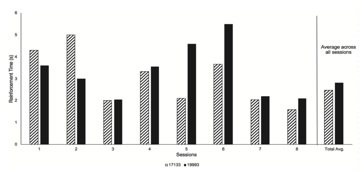 Using data drawn from the videos from the eight sessions of the final phase (5), Figures 2 and 3 depict quantitatively the equity of the responses and reinforcers. Figure 2 shows the difference between the total time each pigeon spent depressing the platform (Platform Time) during successive trials of the final eight sessions. These data were calculated by subtracting the duration of platform time for 17133 from the duration of 19993’s for each pair of trials. Data points below zero indicate that 17133 spent relatively more time engaging in the platform response, whereas data points above the zero line indicate that 19993 spent more time engaging in that response. By Sessions 7 and 8, the data points gravitate closer to the zero line, indicating equity of platform standing resulting in less variable reinforcement durations than in the earlier sessions. To further show the equity of reinforcement, Figure 3 provides the mean reinforcement time (the amount of time each pigeon had access to food via the other pigeon’s platform response/number of reinforcers delivered) for each pigeon during each of the 8 sessions of the last phase of the study. In no session did the reinforcement time for either pigeon differ by more than 2.5 s. Over these 8 sessions, the average reinforcer duration for 17133 was 2.47 s and for 19993, 2.81 s. The session duration was time-based, so the number of trials varied in each session.