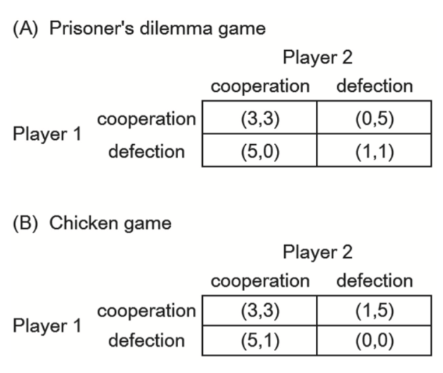 Payoff matrices of (A) the prisoner’s dilemma game and (B) chicken game. Left and right numbers in each cell represent reinforcer amount (number of food pellets) given to Players 1 and 2.