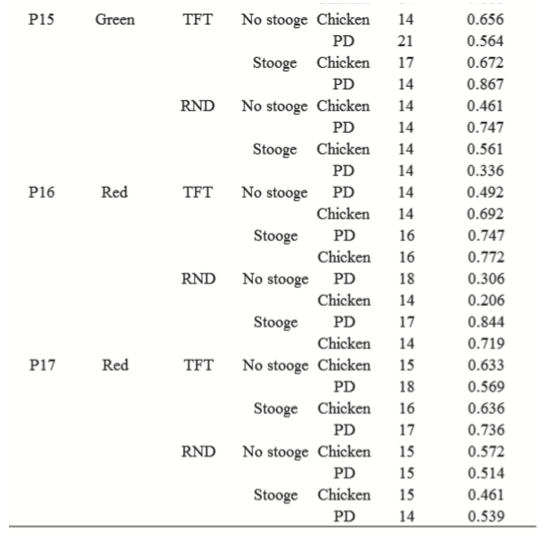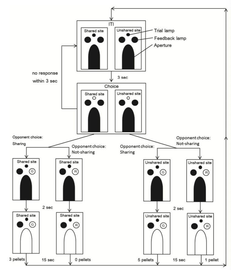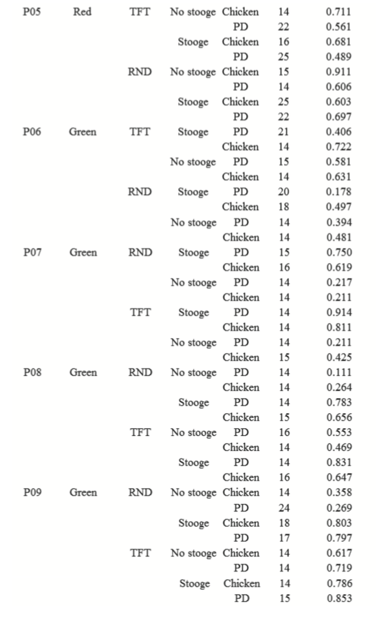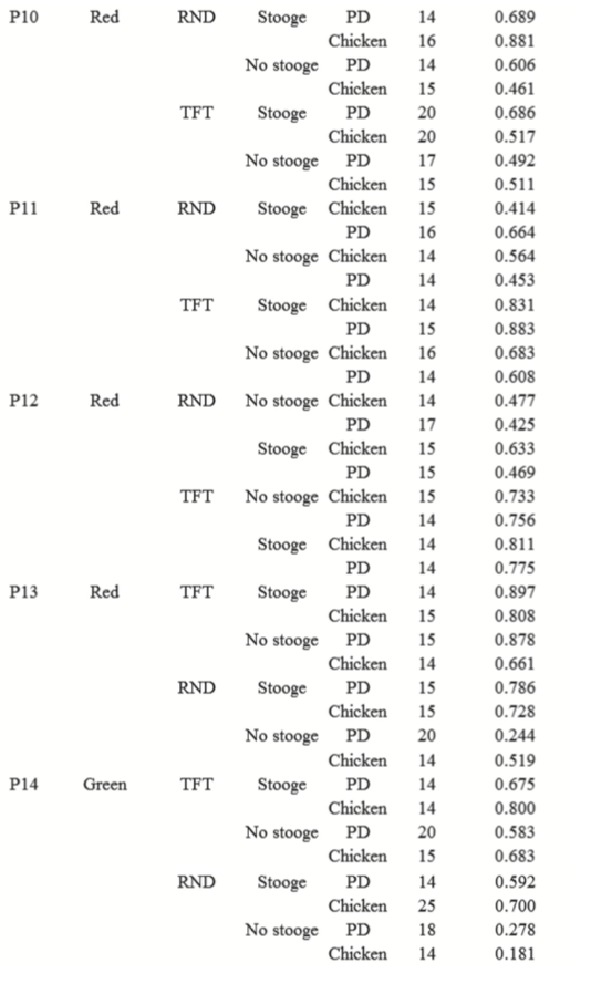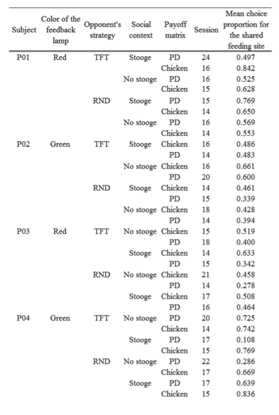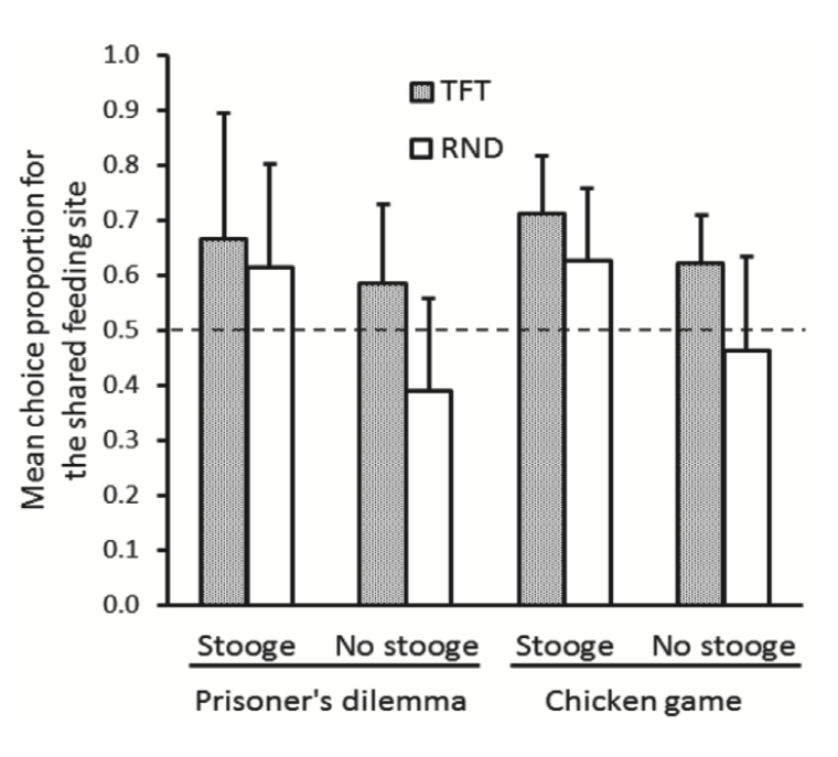 Stephens et al. (2002) examined cooperative choice in blue jays in the PD game by using two adjoining operant chambers each of which housed a single bird. During each trial, birds moved to one of the perches to choose between cooperation and defection. After a choice was made, each bird could see its opponent through a transparent wall. One of the blue jays was a stooge that had been trained to choose between cooperation and defection indicated by a computer. They examined the effects of the TFT and All-D (choosing defection in all trials) strategies taken by the stooge. The choice proportion for cooperation in the TFT condition (about 0.4) was higher than that in the All-D condition (less than 0.1). Because they did not use a no-stooge condition, the effect of the stooge conspecific cannot be determined.