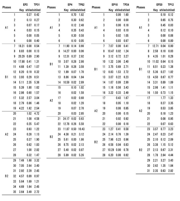 Key-peck and shield-peck response rates (number of responses per min) for experimental and target pigeons of each pair in all sessions during each phase. The key-peck responses were only for the experimental pigeons. The alphabet “EP” preceding the pigeon number denotes the symbol for the experimental pigeons, the “TP” for the target pigeons. Both A1 and A2 phases were the no-reinforcement phases. Both B1 and B2 phases were the CRF-EXT phases.