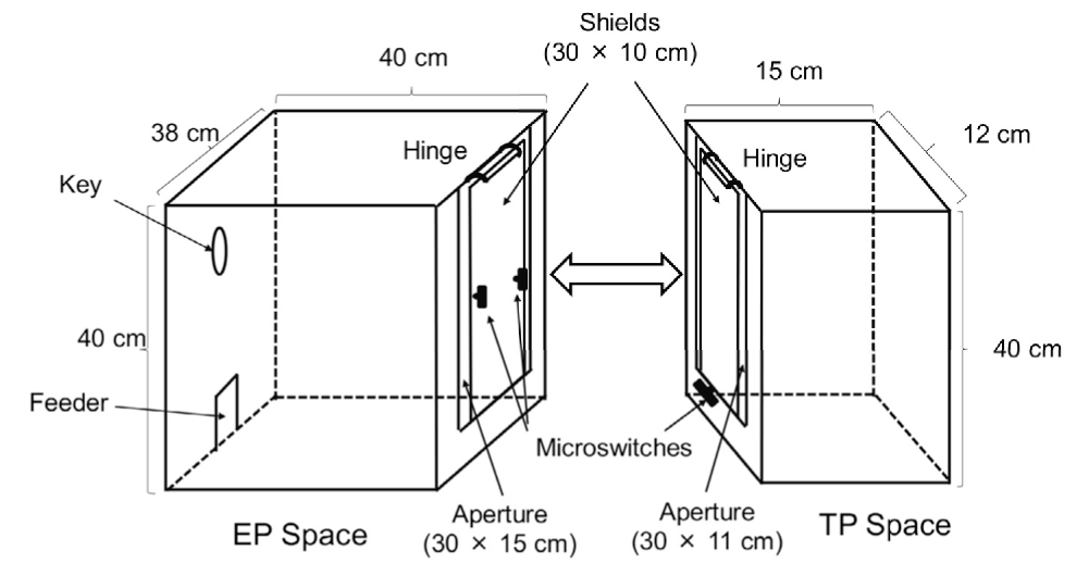 Modified operant chamber consisting of the space for an experimental pigeon (EP) and that for a target pigeon (TP). Respective spaces were described in isolation to make them clear. In the experiment, two spaces were set adjacently