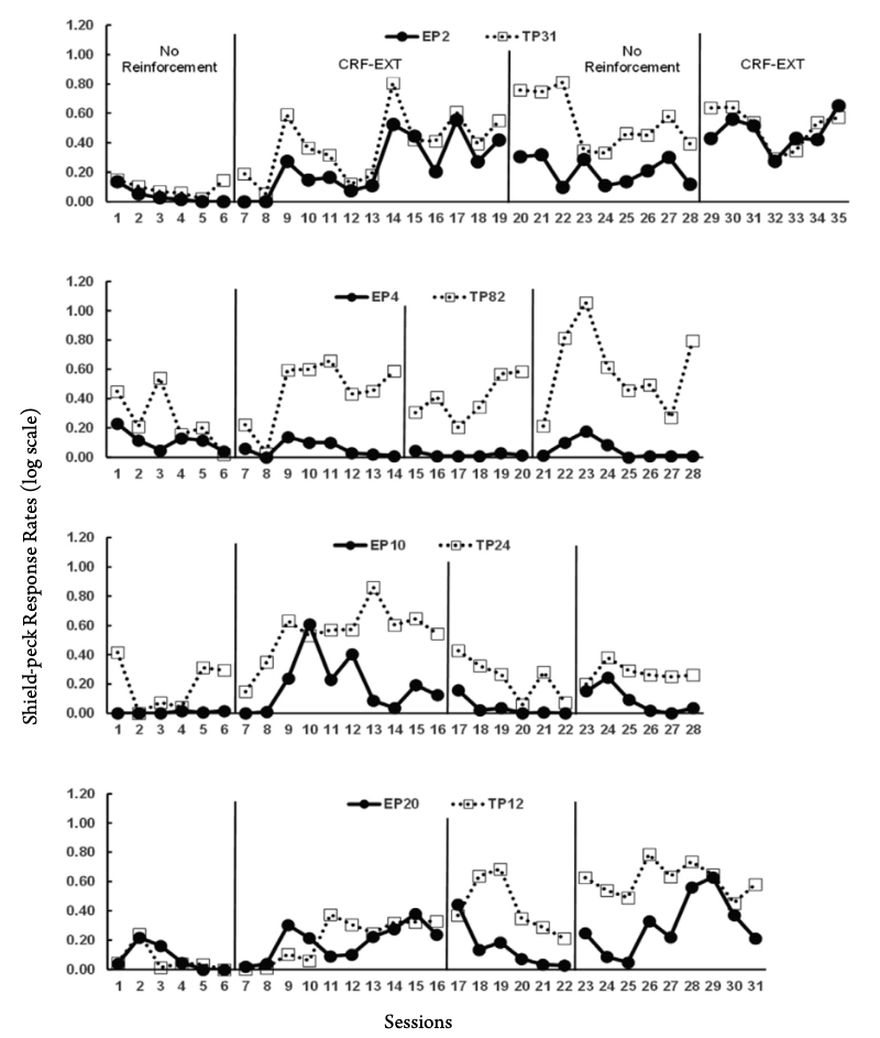 As described above, there were some phases in which the direction of change in shield-peck response rates was similar between EPs and TPs. The similarities may reflect some relation between EP’s and TPs’ shield-peck responses. To further quantify this relation, Kendall’s coefficient of correlation (τ) was determined between the log-converted shield-peck response rates of EP and those of TP for each pair over all sessions of both A and B phases. All pairs except the pair of EP4 and TP82 showed significant correlations (EP2-TP31: τ = .577, . < .001; EP10-TP24: τ = .495, . < .001: EP20-TP12: τ = .433, . < .001). We do not know which pigeon’s (EP’s or TP’s) behavior mainly contributed to the creation of this relation because we did not control either pigeons’ behavior as independent variables. However, as most EPs’ and TPs’ rates of shield-peck responding were higher during Phase B than during Phase A, the relation between EPs’ and TPs’ shield-peck responses during the two B phases could be that of responses to each other’s behavior. First, the increase in shield-peck responses of the EPs could be schedule-induced by the B phases. This increase in shield-peck responses could trigger shield-peck responses on the TPs. After that, the exchange of responses between both pigeons could escalate into higher response rates for both pigeons. When schedule-induced behavior of the EPs decreased during the A phases, the TPs’ shield-peck responses could also decrease. Similar response patterns between EP and TP of each pair could reflect such a response exchange between them. In that case, the TPs’ behavior could be induced by the EPs’ behavior.
