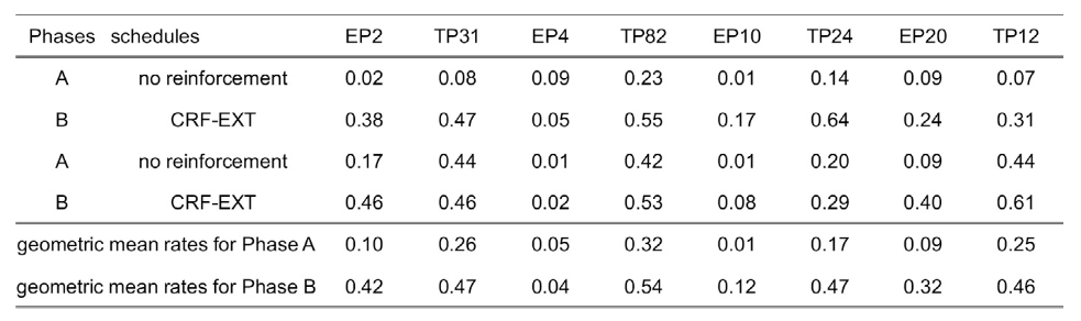 Procedure. Prior to the experiment, each EP received some feeder training sessions and shaping of the key-pecking response for food in the operant space, with the TP space empty. After each EP key pecked consistently, its paired TP was introduced into its space and four phases (ABAB) were conducted. The A phases were no-reinforcement phases (cf., Gentry, 1968) and the B phases were continuous reinforcement-extinction phases (hereafter, CRF-EXT; cf., Azrin et al., 1966). The phases were changed when systematic trends were absent on visual inspection of each EP’s shield-peck response rates (number of shield-peck responses per min) within each phase.