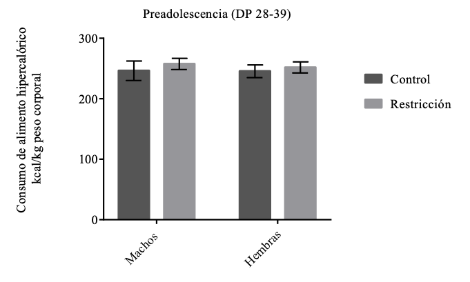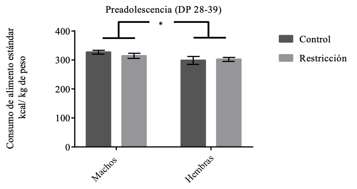 Nota. Consumo de alimento hipercalórico (Kcal/kg de peso corporal) durante la preadolescencia (DP 28-39), para machos y hembras control (gris oscuro) y con restricción alimentaria durante la gestación (gris claro). Las barras indican la M±EE, (* p=0.04).