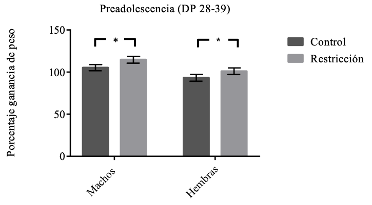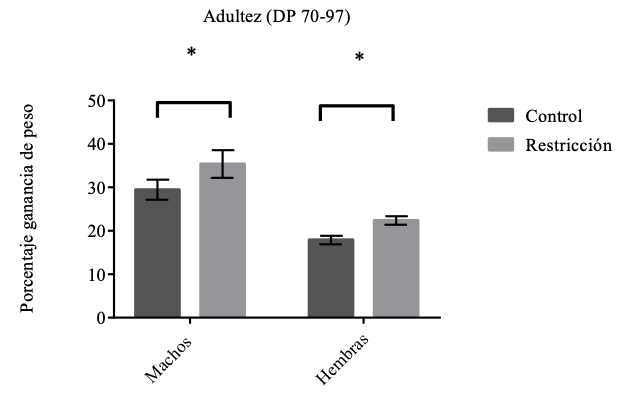 Nota. Porcentaje de ganancia de peso para machos y hembras, control y con restricción alimentaria durante la gestación, en la adultez (DP 70-97). Las barras indican la M±EE, (* p=0.0162).
