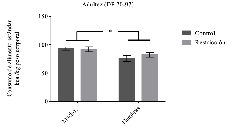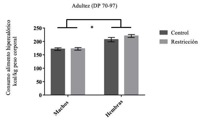 Nota. Consumo alimento hipercalórico (Kcal/kg) / diario para machos y hembras control y con restricción alimentaria durante la gestación en la adultez (DP 70-97). Las barras indican la M + EE.