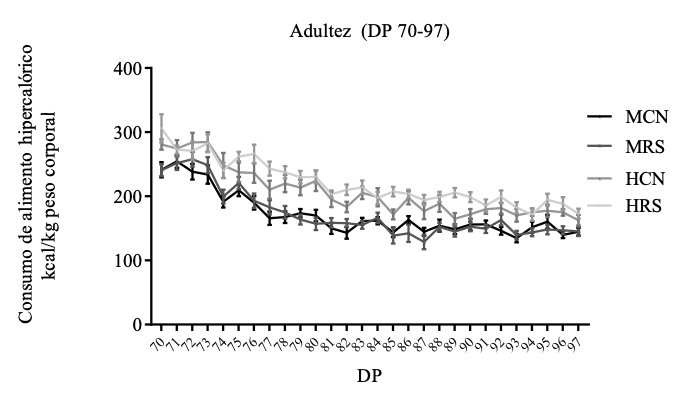 A partir del destete (día postnatal (DP) 22), las crías, fueron sexadas y las camadas se estandarizaron a 10 crías cada una. En el DP 25 se formaron cuatro grupos: machos control (MCN), hembras control (HCN), machos restricción (MRS) y hembras restricción (HRS); se colocaron 3 ratas por caja (8 cajas por grupo), esta decisión se tomó debido a que las recomendaciones en salud animal para roedores de laboratorio sugieren que después del destete se coloquen a los animales en pares o triadas con el propósito de minimizar los efectos que derivan de la separación materna. A partir del DP 28, ambos grupos fueron expuestos por 12 días a un alimento hipercalórico y apetecible. Al mismo tiempo tenían acceso a alimento estándar. La conducta alimentaria se registró diariamente pesando el alimento tanto hipercalórico como el estándar (cada día se les daba 50gr de cada alimento y al día siguiente se pesaba y se le restaba lo que dejaban); mientras que el peso corporal se registró cada tercer día.