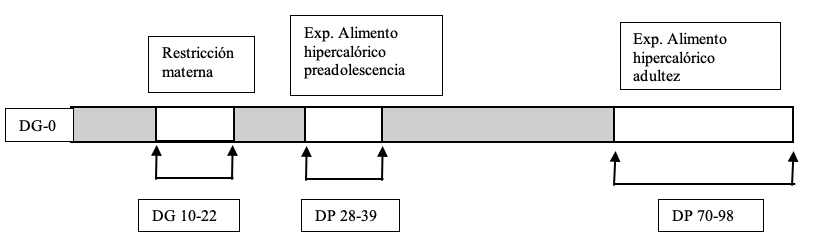 Se aparearon un total de 16 ratas Wistar de aproximadamente 4 meses de edad, obtenidas del bioterio del Instituto de Neurociencias, de la Universidad de Guadalajara. Cada hembra se puso con un mancho en una caja habitación grande y se registró que tuviera 3 eyaculaciones para poder asegurar que quedaran preñadas. Posteriormente en el día gestacional 0 (DG 0) se colocaron en cajas individuales donde tuvieron acceso a alimento y agua Ad libitum. Al DG 10 fueron divididas de manera aleatoria en dos grupos: grupo control y grupo con restricción; el grupo control tuvo acceso a alimento estándar (croqueta de laboratorio o alimento balanceado) y agua Ad libitum durante todo el periodo de gestación y lactancia. Por otro lado, el grupo con restricción alimentaria tuvo acceso al 50% de alimento estándar (de acuerdo con el consumo del grupo control) desde el DG 10 y continuó así hasta el día del nacimiento (DG 22). Durante este periodo se pesaban a las hembras cada tercer día, para registrar el aumento de peso corporal. Posteriormente en la lactancia, se restableció el libre acceso al alimento.