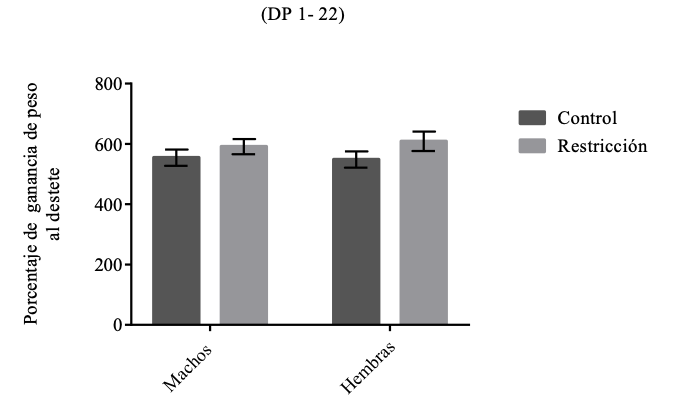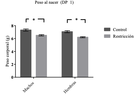 La restricción alimentaria durante la gestación resultó en bajo peso de las crías en comparación a las crías de las hembras control, este resultado es consistente con la literatura que establece que una restricción alimentaria durante un periodo específico de la gestación es suficiente para que las crías nazcan con un bajo peso (Bonesso-Alves et al., 2015; Desai et al., 2004).