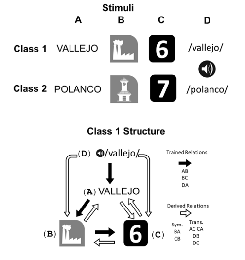 Two stimulus classes composed of 4 elements were used for this study. The elements in each class corresponded to different representations of two public transport stations in Mexico City: stimuli A were the written names of the stations presented in upper case letters; stimuli B were the pictorial representations of these stations; stimuli C were the numbers of the public transport lines to which the stations belonged, presented as digits; and stimuli D were the auditory names of the stations; /vallejo/ and /polanco/ (see upper part of Figure 1). The lower part of Figure 1 shows the structure of class 1, where trained baseline relations are marked with black arrows and derived relations used for tests are marked with white arrows. The same structure was used for class 2.
