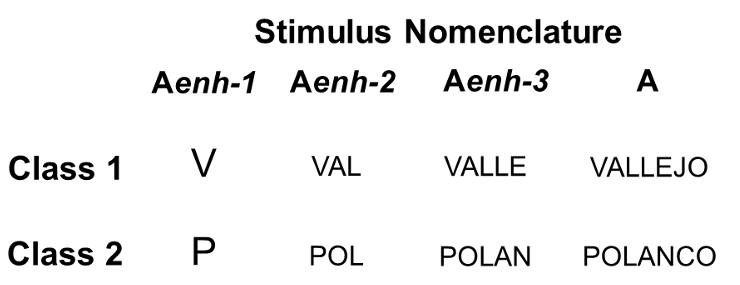 We initially presented the AB and BC training using stimuli A in its original forms (Figure 1). As we will detail in the Results section, during the first two days of training David showed difficulties in mastering training block 3; when A1B1 and A2B2 trials were interleaved. Therefore, from day 3 we started the training trials with the same structure and sequence as depicted in Table 1, but instead of using the words VALLEJO and POLANCO, we used enhanced forms of stimuli A. Our manipulation to increase perceptual differences of stimuli A consisted of presenting only the initial letter of each word; V or P, as depicted by stimuli A1enh-1 and A2enh-1 in Figure 2. These were also displayed in a larger size compared with the size of the initial letters used as A1 and A2. Notably, this method was based on facilitating the perceptual discrimination of stimuli A, which may be complementary to procedures more focused on training discriminative responses (e.g., naming) to different sample stimuli (Constantine & Sidman, 1975; Saunders & Spradlin, 1990, 1993). David did not show difficulties discriminating stimuli B during BC trials.