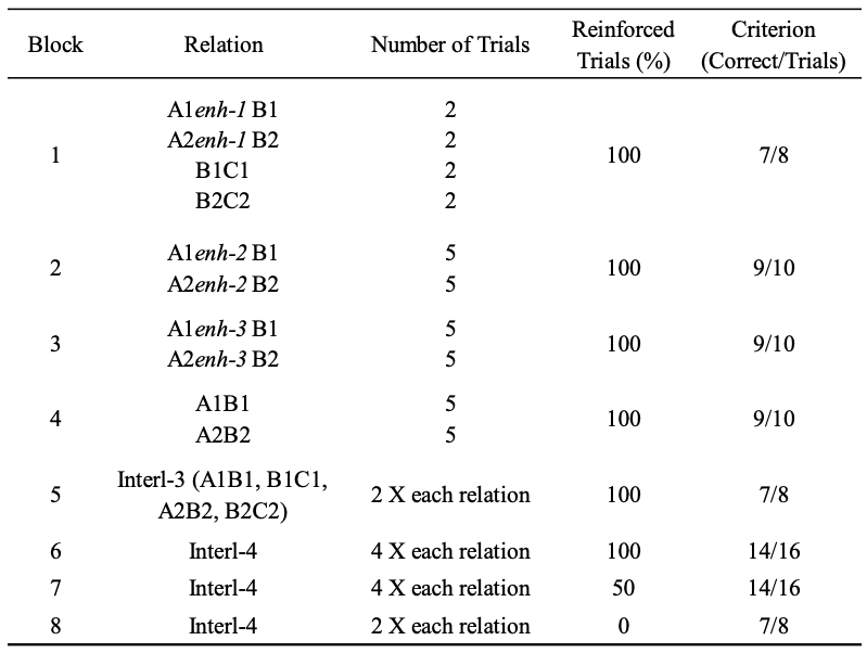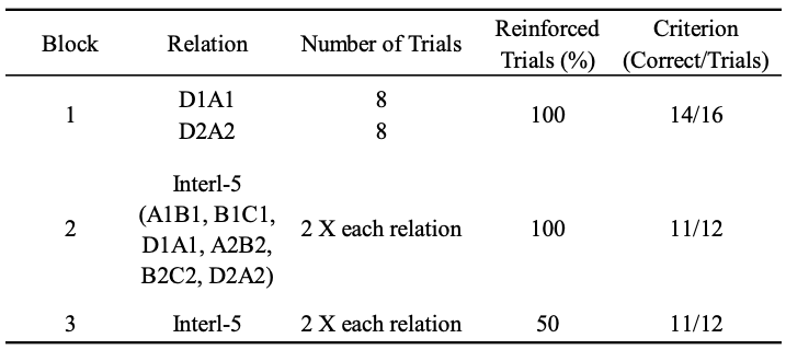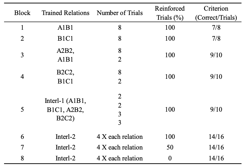 We then presented the AB and BC relations interleaved in training blocks 5 and 6. During Blocks 7 and 8, the four stimulus relations were presented again but the reinforcement probability was decreased to 50% and 0%, respectively (Table 2).