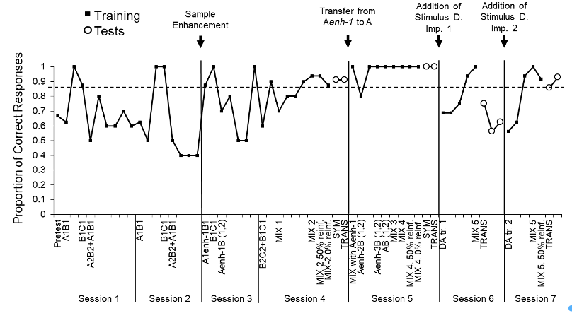 At the beginning of the third session, we programmed training with the enhanced forms of stimuli A. David initially showed again a disruption in accuracy when A2enh-1B2 trials were interleaved with A1enh-1B1 trials. However, he demonstrated higher motivation to respond; he started to be more sensitive to the programmed reinforcement and we decided to maintain the presentation of these training trials in this way. By the fifth block of A2enh-1B2 interleaved with A1enh-1B1 trials, he achieved an errorless performance, showing indication of correct sequential discrimination of sample stimuli (Figure 3).