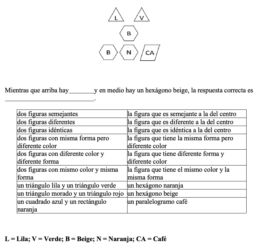 Para los grupos con respuesta verbal (Grupo 3 y 4) se presentó la siguiente instrucción: A continuación, se presentarán una serie más de problemas. Sin embargo, tu tarea ya no será seleccionar una figura de la parte inferior. Ahora deberás observar con atención el problema situado en la parte superior de tu pantalla, en la mitad del monitor, se encuentra un texto incompleto, tu trabajo será completarlo: Selecciona dos de las dieciocho opciones que se presentan en el lado inferior de la pantalla, de tal forma que, al hacerlo, el texto describa el problema mostrado así como la respuesta que tú consideres correcta.