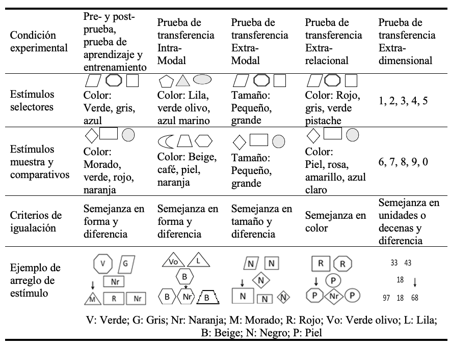 La Tabla 1 sintetiza el diseño experimental utilizado el cual consideró cinco fases experimentales. Todos los participantes comenzaron con una preprueba la cual debían contestar con menos del 50% de aciertos para continuar en el estudio. Enseguida, se sometieron a una fase de entrenamiento en donde debían contestar con más de 95% de respuestas correctas en, al menos, un bloque. Si no alcanzaban el criterio de desempeño después de 5 bloques de entrenamiento, los participantes no podían continuar en el estudio. Después, se expusieron a una fase de prueba de aprendizaje (similar al entrenamiento pero sin retroalimentación) que debían contestar con más del 85% de aciertos. Los participantes que cumplieron con este criterio se sometieron a una fase de pruebas de transferencia la cual fue diferente para cada grupo considerado en el diseño experimental. El grupo 1 se expuso a una secuencia de presentación de las pruebas en orden de complejidad ascendente (intramodal, extramodal, extrarelacional y extradimensional) con respuesta de igualación no verbal. El grupo 2 se expuso a una secuencia de presentación de complejidad descendente (extradimensional, extrarelacional, extramodal e intramodal) con respuesta de igualación no verbal. El grupo 3 se expuso a una secuencia de complejidad ascendente con respuesta de igualación no verbal. El grupo 4 se expuso a una secuencia de complejidad descendente con respuesta de igualación no verbal. Finalmente, todos los participantes se sometieron a una fase de postprueba.