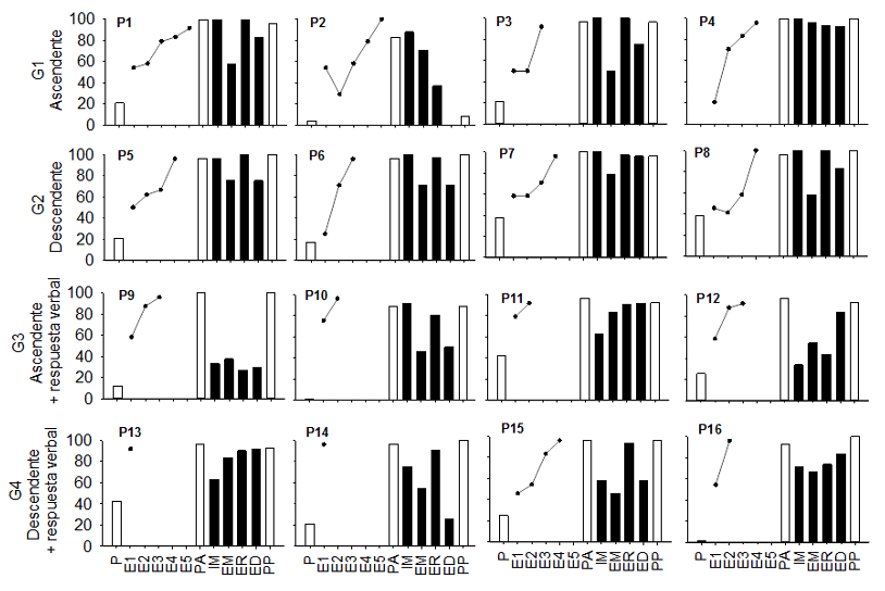Aunque los grupos se sometieron a diferentes secuencias de presentación de las pruebas de transferencia, en la Figura 3 se muestran el porcentaje de aciertos en cada una de ellas en orden ascendente para favorecer la comparación entre los grupos. Como puede observarse, al comparar el Grupo 1 con el Grupo 2 (con respuestas de igualación no verbal), cuya diferencia fue el orden de presentación de las pruebas de transferencia, los participantes del Grupo 2 (orden de complejidad descendente) lograron mejores desempeños. De hecho, el participante P2 (del Grupo 1 con un orden de complejidad ascendente) fue el único que presentó un desempeño menor en la postprueba en comparación con la prueba de aprendizaje. Por otra parte, al comparar el Grupo 3 con el Grupo 4 (con respuestas de igualación verbal), cuya diferencia fue el orden de presentación de las pruebas de transferencia, los desempeños de quienes se sometieron a una secuencia de complejidad descendente fueron ligeramente mejores. De hecho, el participante P9 fue el único que obtuvo porcentajes de respuestas correctas por debajo del 40% en todas las pruebas de transferencia. Por último, al comparar los Grupos 1 y 2 (respuestas no verbales) con los Grupos 3 y 4 (respuestas verbales) se nota que los desempeños de los participantes a los que se les requirió una respuesta de igualación verbal fueron más bajos que los desempeños de quienes contestaron con respuestas de igualación no verbales.