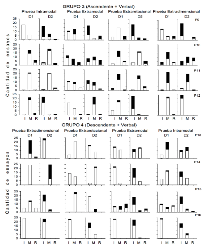 Se emplearon cuatro diferentes pruebas de transferencia (intramodal, extramodal, extrarelacional y extradimensional) con 24 ensayos cada una y sin retroalimentación. El orden de presentación de las pruebas y el formato de respuesta varió para cada grupo experimental (véase Tabla 1). La instrucción presentada antes de las cuatro pruebas de transferencia fue diferente para los grupos de respuesta de igualación no verbal y verbal. A los grupos de respuesta no verbal (Grupo 1 y 2) se les presentó la siguiente instrucción: A continuación, se presentarán una serie más de problemas. No obstante, la manera de solucionarlos será con la misma lógica.