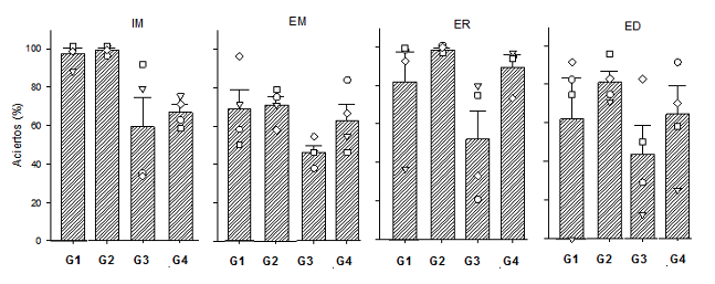 Nota. Porcentaje promedio de aciertos en cada prueba de transferencia (barras) y porcentaje de aciertos de cada participantes (puntos). Las barras de error representan la desviación estándar. IM: Prueba intramodal; EM: Prueba extramodal; ER: Prueba extrarelacional; ED: Prueba extradimensional. Los grupos G1 y G2 emplearon respuestas no verbales mientras que G3 y G4 respuestas verbales. Las pruebas se presentaron en orden ascendente para G1 y G3 mientras que en orden descendente para G2 y G4