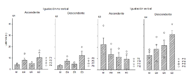 En los grupos con respuesta no verbal se aprecia que la latencia aumenta de la mano de la complejidad de la tarea. Es decir, en las condiciones en que los participantes presentaron mayor número de errores, también presentaron latencias más altas. Para los grupos en los que hubo una respuesta de igualación verbal, se observa que el orden de exposición a las pruebas sí afectó las latencias. Tanto el Grupo 3 como el Grupo 4 presentaron latencias más altas en la primera prueba de transferencia (IM y ED respectivamente) que disminuyeron con el paso de las pruebas.