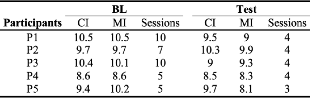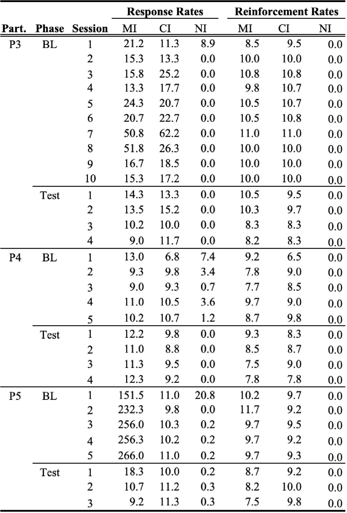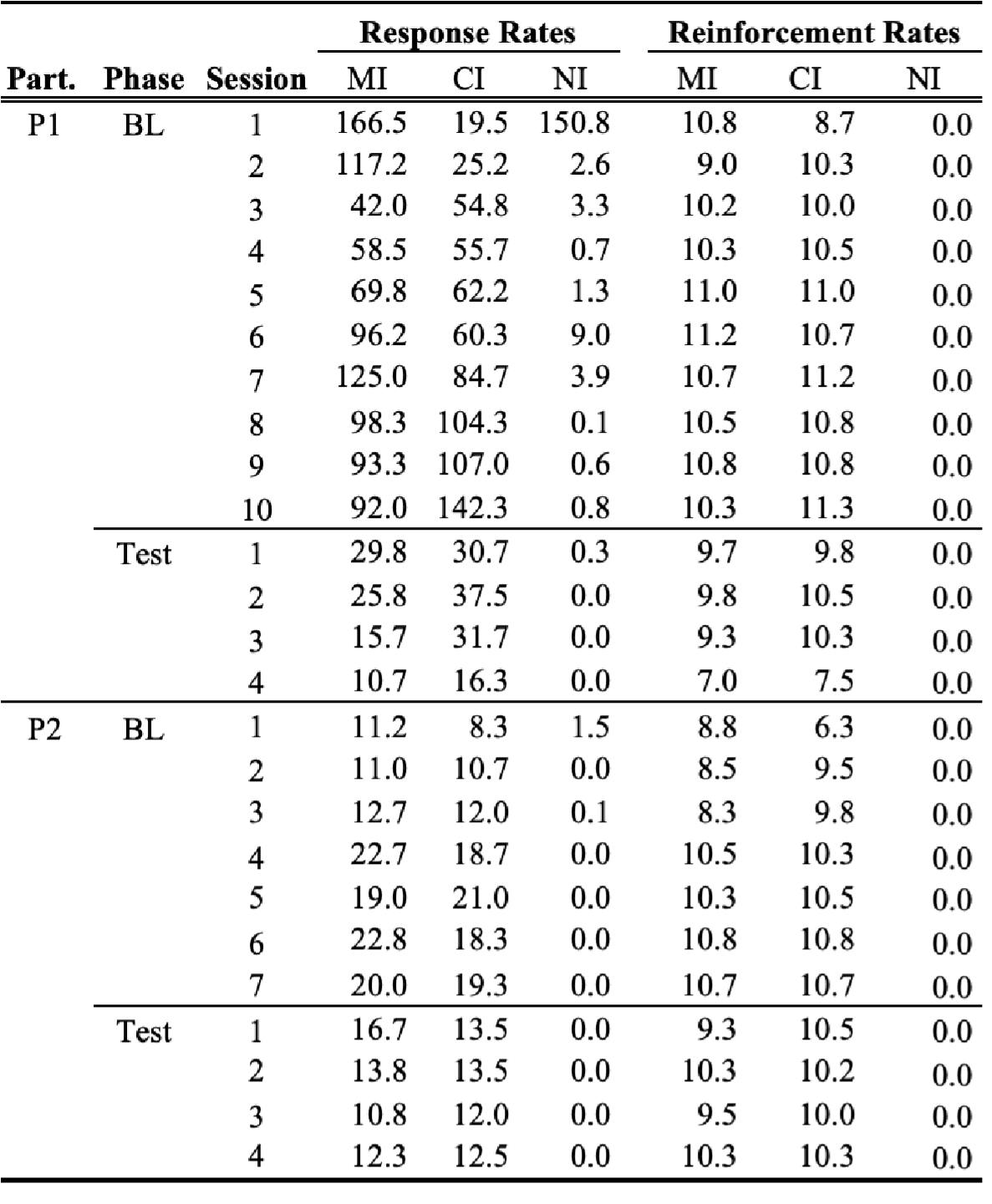Table 2. Mean reinforcement rate (per min) of all BL and Test sessions during the CI and MI components and number of sessions in each phase