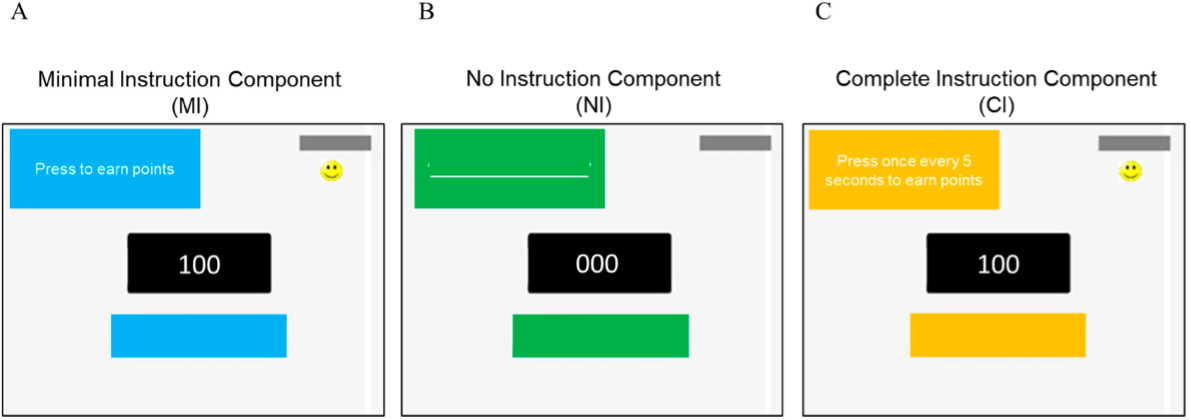Note. Computer screen layout in each component during the experimental sessions, showing the (A) Minimal Instruction Component (MI), (B) No Instruction Component (NI), and (C) Complete Instruction Component (CI).