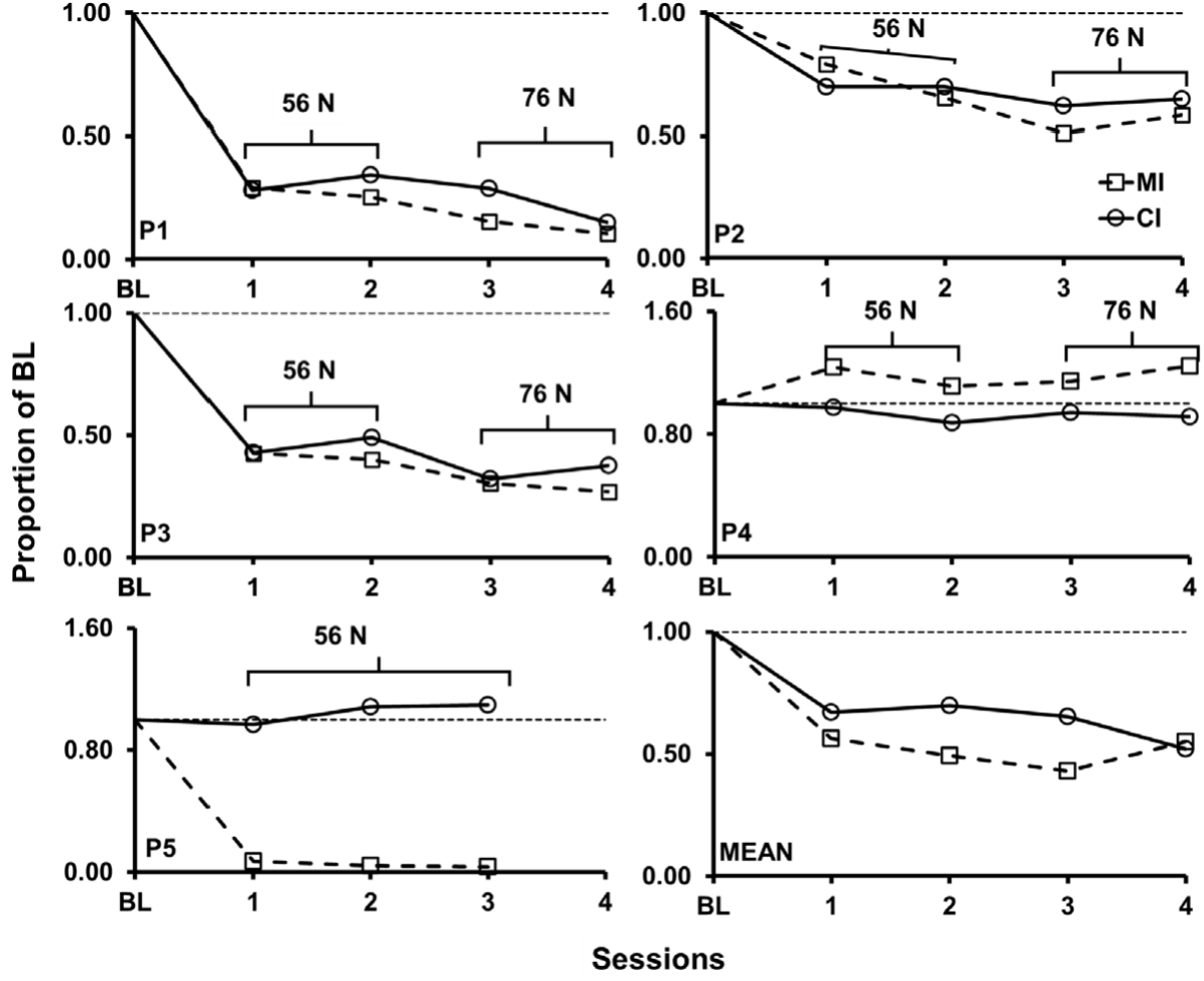 Note. Response rates during the test sessions as a proportion of mean response rates during the last four BL sessions for each participant in both the CI and MI components and mean response rates of all participants during the test session in both components. The force that was required to press the spring button is indicated in each graph. Note the different Y-axis scales among the graphs.