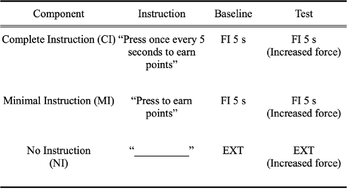 The present study aimed at bridging this gap by examining the effects of different levels of instruction’s completeness on behavioral persistence, expanding the findings of Podlesnik and Chase (2006). Participants responded to a multiple schedule of reinforcement during a BL, followed by a test condition in a within-subjects design. Instructions were manipulated in their completeness and increases in response force were used as the disruptive event.