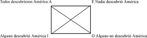 Los presupuestos nos permiten afirmar que sus contradictorios, las oraciones universales, son falsos puesto que no todos descubrieron América y también es falso que ninguno lo hizo. Las oraciones particulares son ambas verdaderas pues alguien (Colón) lo hizo y alguien (digamos Magallanes) no lo hizo. En este cuadrado de presupuestos las universales son falsas y las particulares verdaderas (o al menos se cree que son verdaderas) (Fig. 1).