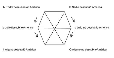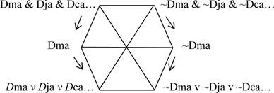 El hexágono nos ayuda a ubicar los data quaestionis y los presupuestos positivo y negativo. Las oraciones particulares pueden expresarse como disyunciones de oraciones singulares, como hemos visto: “Magallanes descubrió América o Julio descubrió América o Colón descubrió América...”. Las oraciones universales pueden expresarse como conjunciones de oraciones singulares: “Magallanes descubrió América y Julio descubrió América y Colón descubrió América...”. Por esta razón podemos tener hexágonos sin cuantificadores, si tenemos un dominio finito de individuos. El siguiente es un hexágono normal, la única diferencia con el anterior son las oraciones internas (Fig. 5).