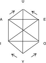 La segunda manera consiste en añadir conectivas que unen un par de oraciones afuera, en la parte baja y en la parte alta del cuadrado respectivamente. Las universales, es decir, las oraciones contrarias se unen con una disyunción y se colocan afuera y arriba del cuadrado (“Todos descubrieron América o Nadie descubrió América”). Las particulares, es decir, las subcontrarias, se unen con una conjunción y se colocan afuera y abajo del cuadrado (“Alguno descubrió América y Alguno no descubrió América”). Estos nuevos extremos son mutuamente contradictorios. Usando las letras usuales del cuadrado, A, E, I y O, y las letras de Blanche Y y U para los nuevos extremos contradictorios obtenemos este hexágono, donde las implicaciones van de abajo hacia arriba (Fig. 3):