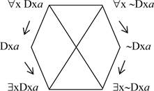 Debemos notar lo siguiente: el hexágono de Sherwood consta de seis oraciones, cuatro cuantificadas y dos no cuantificadas, las oraciones singulares intermedias. En la figura 4 tenemos cuatro oraciones cuantificadas y dos funciones proposicionales que no son ni verdaderas ni falsas. Serán verdaderas o falsas cuando se sustituyan las variables por constantes (un nombre propio en este caso) o cuando se cuantifiquen; ambas posibilidades se excluyen en esta figura. Las funciones proposicionales no son contradictorias, aunque tengan la estructura sintáctica de una contración (Dxa y ~ Dxa) ni se oponen a las demás oraciones.5 En este sentido, el hexágono con los data quaestionis es un hexágono anormal dado que una parte de sus elementos no mantiene ninguna oposición con los otros. Por cierto, la versión negativa del datum quaestionis proviene de la pregunta “negativa” “¿Quién no descubrió América?”. Podemos decir que un hexágono como el de Sherwood captura los dos lados de la pregunta.