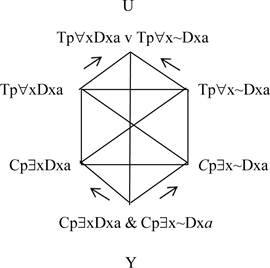Y así tenemos nuestro hexágono de presupuestos (Fig. 6): la oración Y (los presupuestos positivo y negativo) implican a las subcontrarias, y éstas tienen sus contradictorias, las oraciones de arriba, en el lugar de las universales, y cada una de ellas implica a la oración U: