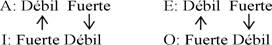 La oración A es universal o fuerte por el cuantificador pero particular o débil por el operador doxástico; lo mismo vale para la oración E. La oración I es universal o fuerte por el operador doxástico, pero particular o débil por el cuantificador; lo mismo vale para la oración O. Las oraciones A y E realmente son débiles, puesto que el operador T gobierna toda la expresión en ambos casos. Las oraciones I y O son fuertes puesto que están gobernadas por un operador fuerte, C. Tenemos pues un cuadrado patas arriba (Fig. 8).
