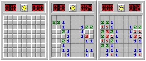 Como se puede ver en el primer estadio mostrado a la izquierda, el juego comienza con todas las casillas cubiertas, con un contador en el ángulo superior izquierdo que disminuye al marcar las 10 minas escondidas, y con un contador de tiempo en la esquina superior derecha. En el segundo estadio mostrado al centro de la figura, ya se ha abierto alguna celda que no está circundada por ninguna mina y eso destapa el resto de las celdas de ese tipo que son adyacentes. Estas celdas se muestran en un color gris mate sin relieve. Al mismo tiempo, muchas celdas muestran ya el número de celdas minadas circundantes. Finalmente, en el último estadio en el extremo derecho de la figura, 10 celdas han sido marcadas como minadas usando las banderas correctamente y el resto de las celdas ha sido destapado sin detonar ninguna mina.