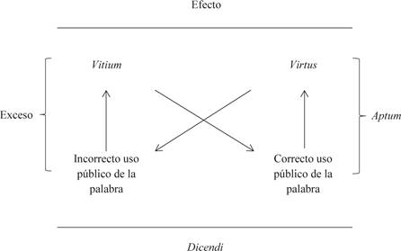 Del mismo modo, tanto virtus como vitium son efectos producidos por el discurso, uno por su éxito; el otro por su fracaso. Obviamente, la competencia del orador o rétor juega un papel preponderante, pero el instalarse como sujeto que opera los elementos del discurso depende de su conocimiento de los fundamentos del Ars rhetorica (saber-hacer uso público de la palabra). La sintaxis completa en la que se funda la estructura normativa del Ars rhetorica toma la forma descrita en la Figura 1.
