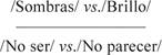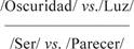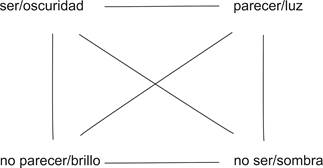 Mientras que las /sombras/ se oponen al /brillo/ en el plano de la expresión, de la misma forma que el /no ser/ al /no parecer/ en el plano del contenido: