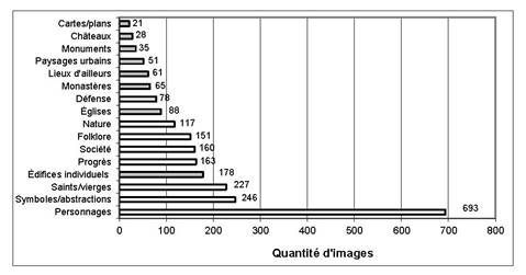 Estos periodos contienen un cierto número de rúbricas temáticas que representaban el conjunto de los sellos. Con el ánimo de sintetizar, y aprovechando la experiencia de los gráficos polares, se procedió a determinar cada una de las rúbricas representadas; de esta forma se pasa de veinticinco temas iniciales a dieciséis. Estos temas son: santos/vírgenes, iglesias, monasterios, monumentos, paisajes urbanos, edificios, castillos, mapas, personajes, sociedad, defensa, progreso, lugares de otra parte, símbolos/atracciones, folklor y naturaleza.