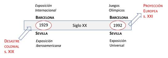 Los eventos tuvieron lugar en dúo: en 1929, dos exposiciones universales se realizaron en estas dos ciudades, repartiéndose la responsabilidad de tal desafío ante los ojos de nacionales y extranjeros. Barcelona, haciendo alarde de una europeización cada vez más afirmada, acogió la Exposición Internacional (o General). En el evento participaron veinte países del continente y dos no europeos: Japón y EE. UU. De su parte, Sevilla fue la sede de la Exposición Iberoamericana. La capital andaluza renovó así su vocación de plataforma ultramarina con América iniciada durante los grandes descubrimientos del siglo XV. Al realizar estos dos grandes eventos, España decide reanudar sus esfuerzos diplomáticos y de comercialización con el mundo, luego de la crisis de finales del siglo XIX generada con la pérdida de su imperio en 1898. Los sellos contribuyen de esta forma a la promoción de una nueva visión del país. Si la cita del comienzo del siglo tiende hacia una recuperación luego de un siglo XIX en decadencia, la segunda cita, la de 1992, se focaliza hacia una España de la Unión Europea, la de Maastricht, que se presenta con la cercanía del siglo XXI. Esta vez las mismas dos ciudades acogen igualmente dos grandes eventos universales: Barcelona organiza los Juegos Olímpicos mientras que Sevilla lo hace con la Exposición Universal. Los cuatro eventos y su ilustración en los sellos sirvieron así de peldaños históricos, soportes visuales de un país que en su respectivo momento deseaba avanzar hacia una nueva era, jugando un papel de primer orden en el contexto continental y mundial (Sello 6).