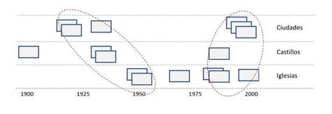 Con este método, el Centro de Estudios Urbanos de la EHESS buscaba detectar rápidamente y de manera metódica los tipos de familias gráficas en general y las familias urbanas en particular, que era el centro de nuestra investigación (Monroy, 2011). El punto de partida que sirvió como modelo fueron unos análisis preliminares sobre la iconografía francesa y que se pueden apreciar en el Panorama de los sellos de Francia (Coste, 2002). En su momento los sellos se organizaron en tiras, clasificándolos por bandas temáticas de manera progresiva en el tiempo: la banda ciudad, la de castillos, la de iglesias… (Figura 2).