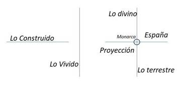 Dos variantes canalizaron la estructura precedente: la variante horizontal y la vertical. Siguiendo la simbólica como base, se consideraba que la horizontal representaría la zona terrestre, el espacio en donde el ser humano se desplaza y actúa, como es el caso de la zona urbana; a este eje lo llamamos le bâti, es decir, lo construido, todo aquello que representaba lo edificado, zona de extensión física y de conquista, zona de apropiación del territorio. Por oposición, tendríamos la variante vertical representando los aspectos experimentados por el ser, le vécu, su vivencia, es decir la existencia humana. Con estos dos parámetros complementarios se elaboró un gráfico de coordenadas x-y en donde las abscisas bâti/vécu, encontraran una cierta coherencia gracias a la simbólica. Desde esta perspectiva, si la abscisa de lo construido (x) es la zona en donde el ser se despliega, entonces determinamos que hacia la derecha ubicaremos las imágenes del país (ciudades de España), mientras que a la izquierda tendremos su doble, es decir su proyección (América). De su parte, en la abscisa vertical (y) se encuentran igualmente dos zonas claramente definidas y opuestas; por un lado, hacia abajo, ubicamos la parte terrestre del hombre (los personajes), mientras que hacia arriba situamos su proyección divina (los santos y vírgenes). Tanto para una u otra abscisa, el punto de encuentro es la figura del Rey como ente aglomerante (Figura 4).