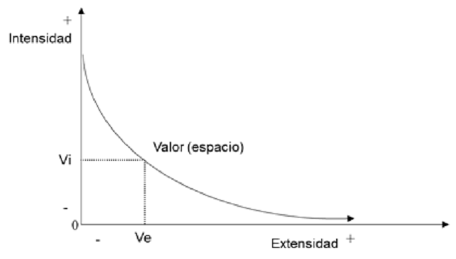 Así, en este ejemplo, el espacio, cumpliría con ser un valor porque es relativo a otros dos valores que lo definen y lo constituyen y, aunque todo pareciera pertenecer al mismo sistema, aquí el espacio cubre el requisito de funcionar como un tercer valor. Esto ocurre porque —pudiendo ser su equivalente— confirma a los otros dos, Vi y Ve, magnitudes que están en comparación con los más o los menos de las dos dimensiones, intensiva y extensiva. Las cuales, siendo opuestas y distintas, funcionan como valencias. Al mismo tiempo, operan como sistemas diferentes, puesto que, dichas dimensiones responden a materias cuyos órdenes no son de la misma naturaleza, sin embargo, claro está, convergentes y correlacionables por el espacio. Evidentemente, aquí la significación aún no se completa, ya que faltaría una comparación más, aquella que tendría que venir de un sistema equivalente pero totalmente externo y que pudiera ofrecer un valor otro con el que el del espacio —aquí analizado en su valoración interna— pudiera ser trocado. Por lo tanto, habría que hacer intervenir otro esquema tensivo del que surgiera un valor que estuviera en correspondencia con el universo semántico al cual pertenece y que pudiera ponerse en relación con el anterior.