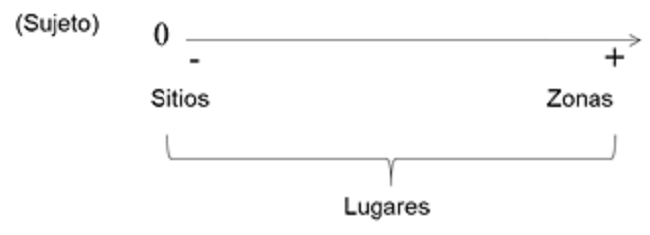 Por su parte, la valencia extensiva, dado que comprende las operaciones inteligibles, permite al sentido del espacio encontrar su definición según los lugares, los cuales se establecen mediante categorías que el sujeto realiza gracias a las ocupaciones de los distintos cuerpos en la extensidad puesto que ellos de por sí marcan los límites. Además, los lugares también encuentran su propia definición según su posición en el eje horizontal. Si ellos se ubican más bien hacia el punto cero, es decir, que han sido forjados por medio de las operaciones de selección, podemos hablar de sitios. Si, por el contrario, los lugares están posicionados hacia el extremo positivo del eje horizontal, hablaremos entonces de zonas, las que a su vez son el producto de las operaciones de mezcla entre unos lugares y otros y donde los límites son menos rigurosos. Así, las zonas presentan las siguientes características: complejidad semántica, imprecisión y un volumen difundido en la extensidad. En cambio, los sitios son más categóricos y tienen sus fronteras bien definidas, así como un volumen de mayor concentración.