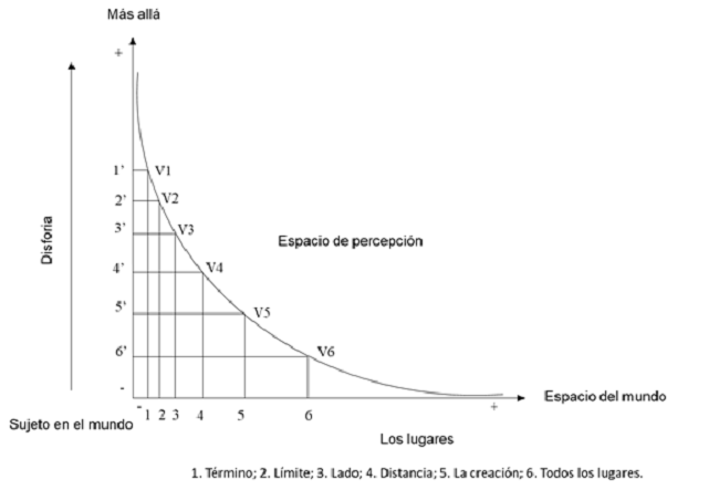 Para adquirir forma, semióticamente hablando, el espacio de percepción necesita entonces de los lugares —ya sea que se trate de sitios o de zonas, que en la Octava Elegía están consignados como “las formas”— en correspondencia con las corrientes de la foria que fluyen en la intensidad. En consecuencia, no podemos pensar en la significación del espacio sin las finas conexiones entre las dos valencias que, en su sintaxis, le otorgan valor.