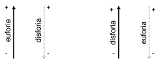 Antes de dedicarnos a la observación del eje horizontal en el que los lugares tienen su desarrollo, quisiéramos aportar una precisión referente al eje vertical que corresponde a la subida o a la bajada de la foria. Ésta, como decíamos, es de doble corriente: por una parte, distinguimos ese curso tónico que promueve el bienestar del sujeto y, en este caso, es que hablamos de euforia, si bien sabemos que un exceso de intensidad de este flujo provoca el efecto contrario, ya que paraliza o destruye la estructura tensiva. Y, por otra parte, hemos señalado esa corriente que va en el sentido contrario del bienestar, es decir, el malestar o disforia. Del mismo modo, un exceso de intensidad de esta corriente disfórica, produce un desequilibrio que redunda en una desestructuración del sujeto. Es importante tener en cuenta que cada línea de sentido tiene sus más y sus menos, su exceso de positividad y su exceso de negatividad, así como, también, sus puntos medios. Y no hay que dejar de observar que, según como se combinen, estos flujos intensivos pueden contrarrestarse o sumarse entre sí (Figura 5):