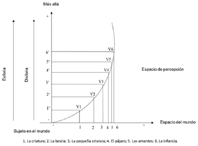 En la estructura tensiva que se va configurando a partir de la “Octava Elegía”, cada uno de estos lugares, ya sean sitios o zonas, del espacio del mundo, tiene su gradación correspondiente, de más, o, de menos, en cuanto a la carga sensible, o foria, que corre en la valencia intensiva. Si retenemos, por ejemplo, el término, marcado con el número 1 en la extensidad, hace par con el grado 1’ en la intensidad, lo cual conforma la correlación V1, valor que se ubica en el espacio tensivo ocupando el rango más alto en la dirección descendente puesto que ya no es el más allá fuera de esta estructura; su contrario será, entonces, V6.